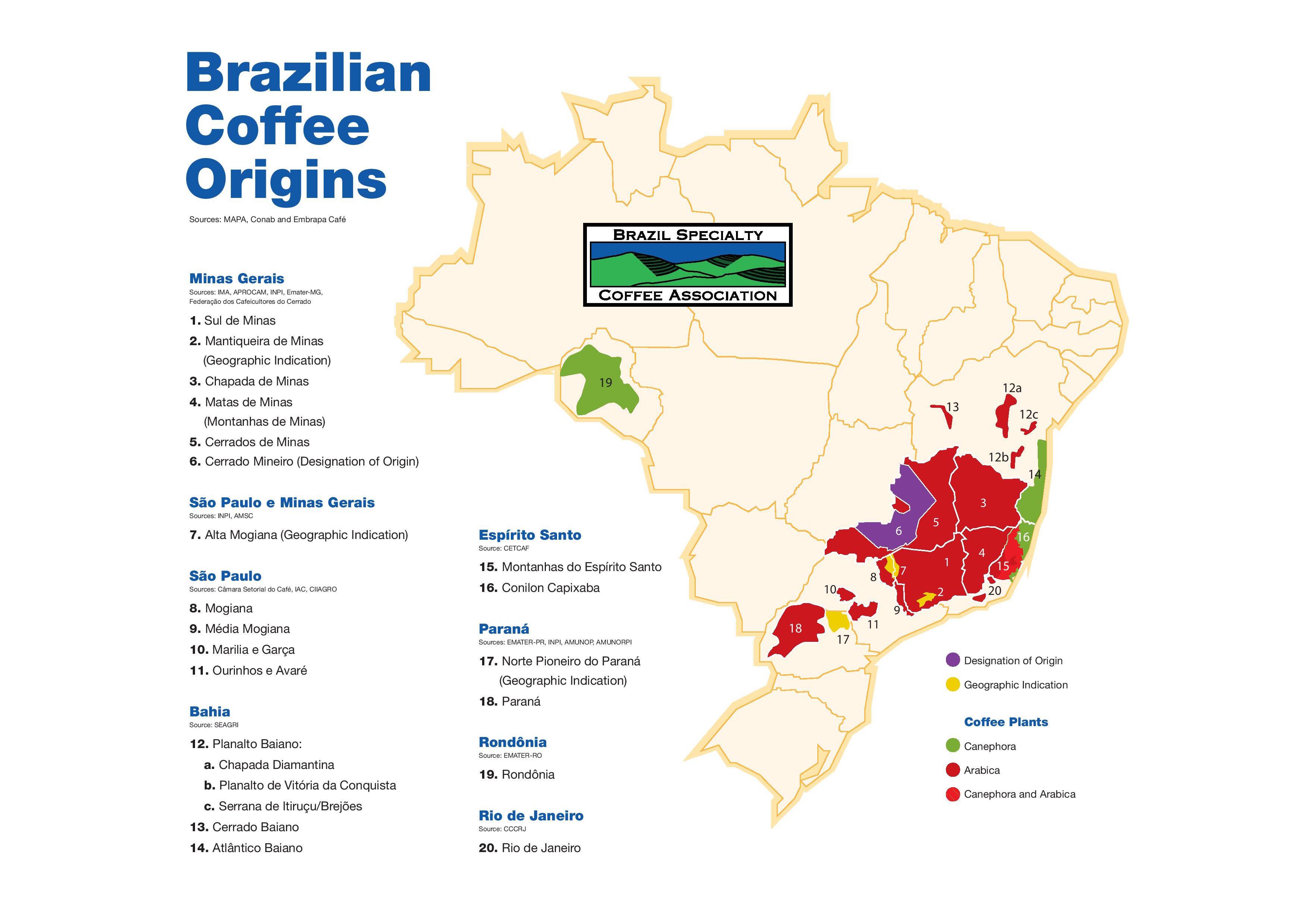 Se estima que Brasil cuenta con 300.000 plantaciones de café repartidas en trece de sus estados, como se menciona en el mapa del café de Brasil. El café brasileño se exporta generalmente en estas formas: Café verde, Café molido y tostado, Café soluble, Extractos concentrados/esenciales, Residuos de café. El café que se cultiva en Brasil es predominantemente de la variedad Arábica, que representa alrededor del 80% de la cosecha total. La temporada de cosecha va de mayo a agosto.
